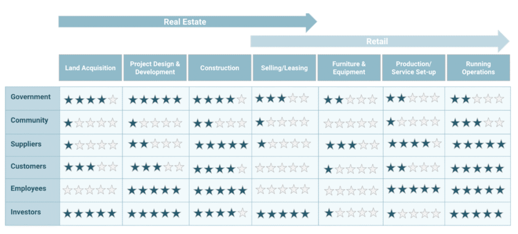 This involved a comprehensive sustainability strategy process to guide the conceptualization and vision of this project. This process included several key components: first, we conducted a materiality analysis to identify critical sustainability topics relevant to construction and retail businesses. Additionally, we developed an Environmental Impact Framework specifically tailored to the retail sector, allowing us to understand and address its unique challenges and opportunities. Utilizing benchmarking and market studies, we gained insights into industry best practices and market trends. Finally, we translated Stone’s sustainability vision into strategic marketing and communication pieces, ensuring alignment between the company’s sustainability objectives and stakeholders’ expectations.