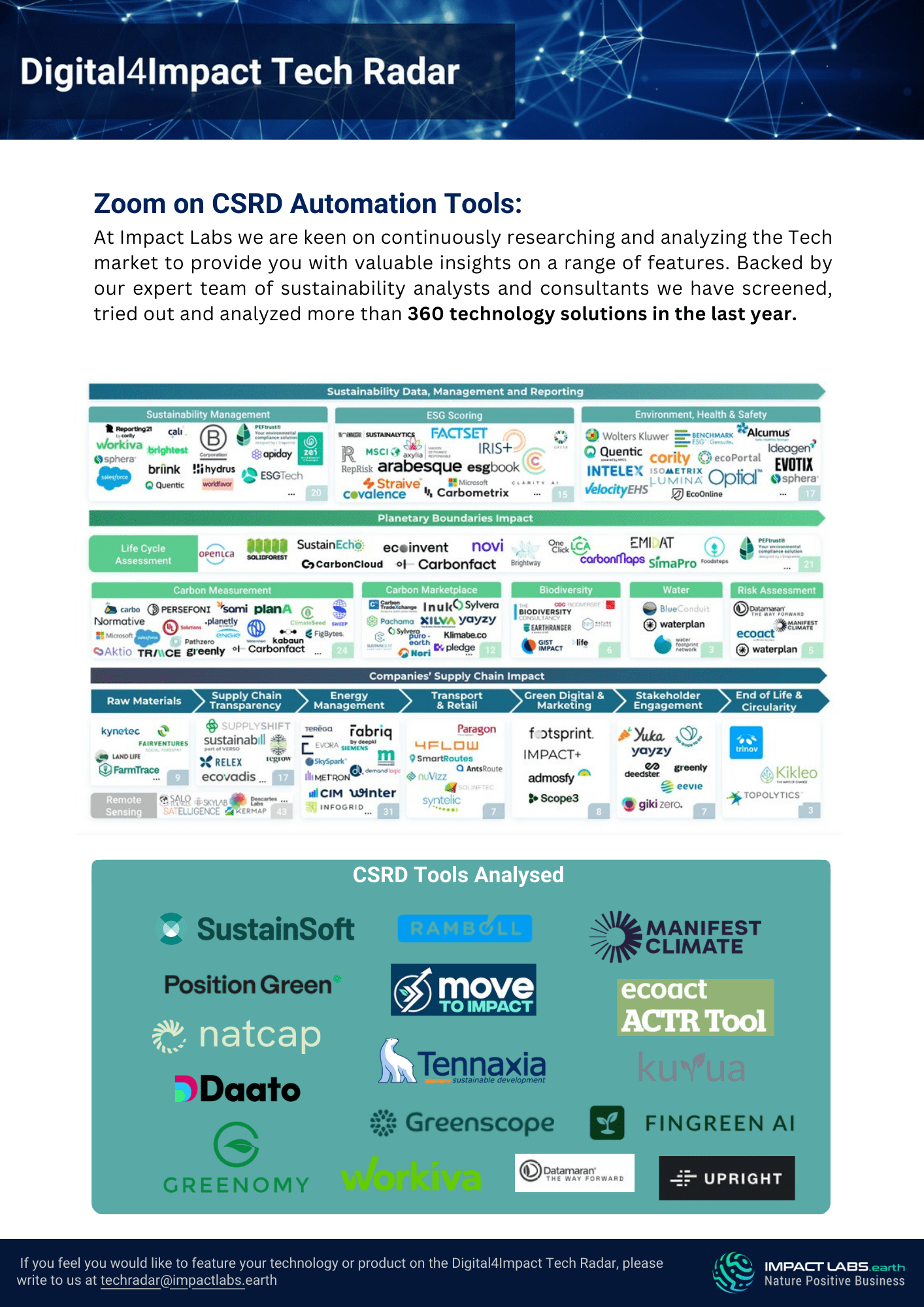 With the initiation of the CSRD legislation in 2024, many medium and large companies will have to start communicating about their emissions (scopes 1, 2, and 3). In that context, analysing this booming market and curating the relevant technologies for everyone’s needs makes sense.