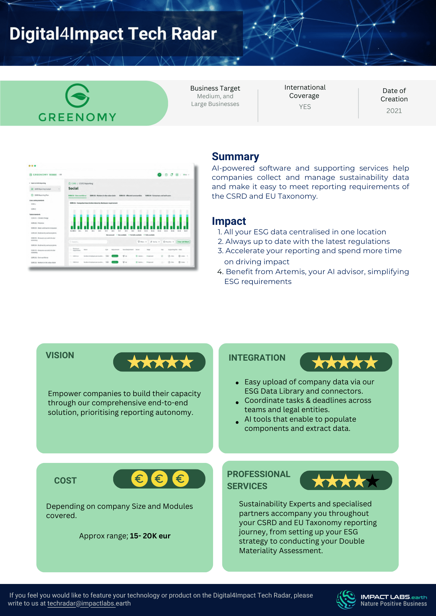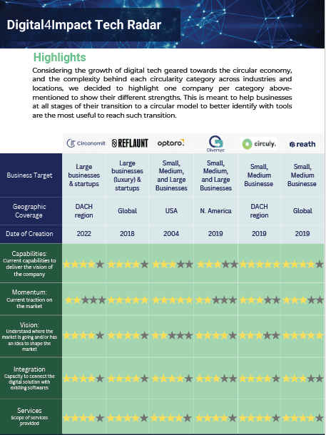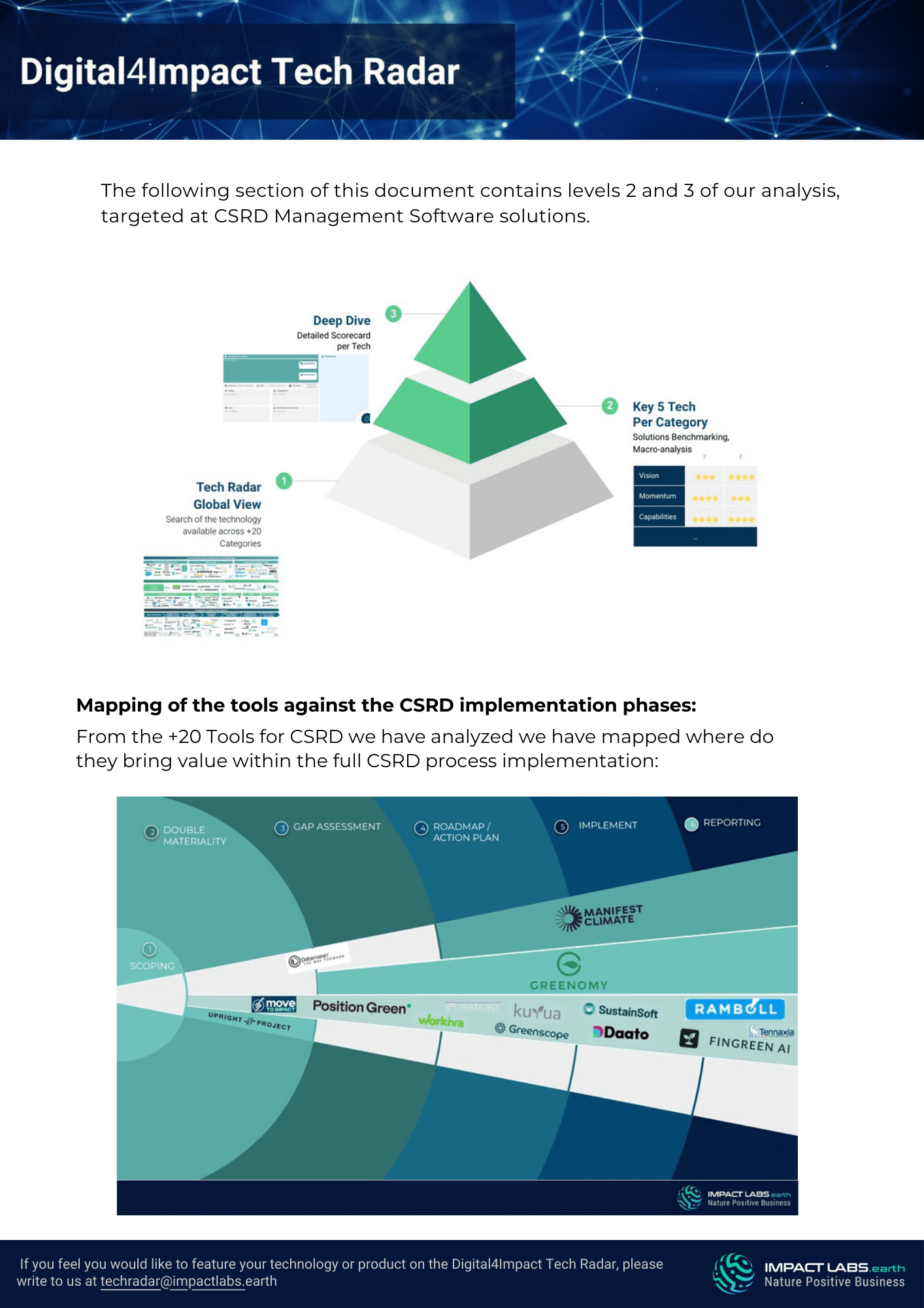 Impact Labs’ Tech Radar goes beyond merely identifying technologies; it helps you align these solutions with your specific company challenges. We have deep industry knowledge of the features, capacity, and maturity of technology through the comprehensive analysis and research of the sustainability market.