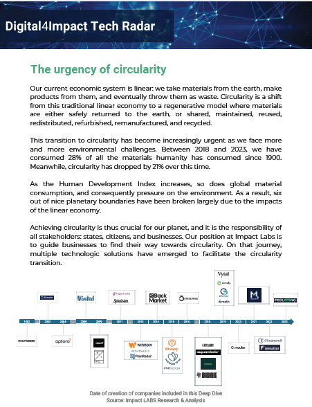 Achieving circularity is thus crucial for our planet, and it is the responsibility of all stakeholders: states, citizens, and businesses. Our position at Impact Labs is to guide  businesses toward circularity by identifying the most suitable technological solutions to facilitate the circularity transition.