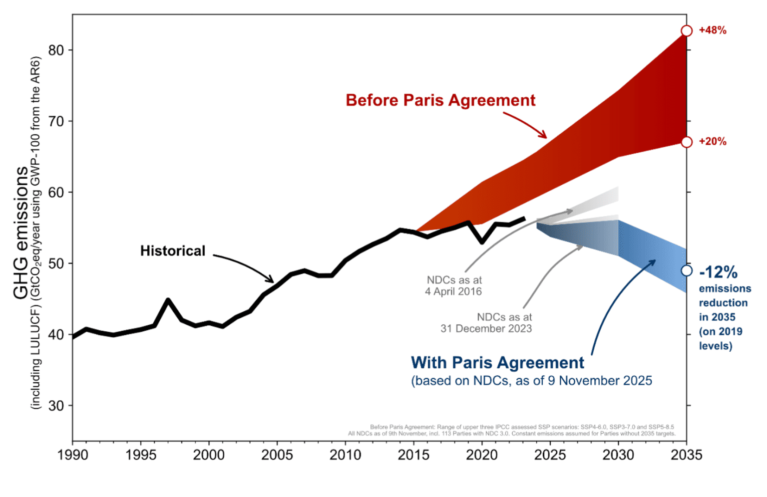 By COP30’s close, 119 nations (representing nearly three-quarters of global emissions) had submitted updated NDCs, but together they deliver less than 15% of the reductions needed by 2035 to keep warming to 1.5°C. UN analysis shows the world heading toward 2.3 – 2.8°C, well beyond safe limits. For context, without the Paris Agreement, emissions were expected to rise 20 – 48% above 2019 levels by 2035; current pledges instead deliver a modest 12% reduction below 2019 levels. This reveals an important truth: the Paris Agreement is bending the emissions curve, but far too slowly.